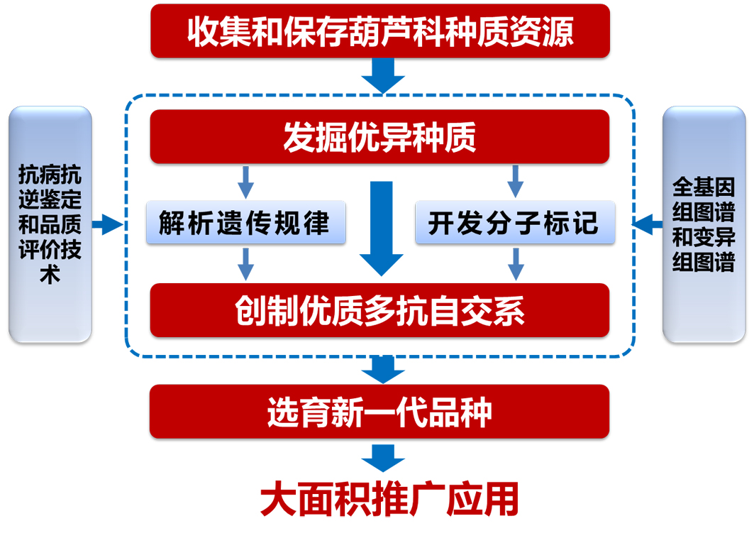 葫芦科蔬菜遗传育种研究室主要围绕种质资源收集与评价、重要农艺性状基因挖掘与机制解析、重要农艺性状功能型标记开发、优异育种材料创制与新品种培育等方面开展研究。在育种材料收集方面,引进国内外各种种质资源上万份,构建了丰富的葫芦科蔬菜种质库。在育种理论探索方面,参与完成了黄瓜和甜瓜的全基因组图谱和变异组图谱,解析了诸多抗病、抗逆和品质相关基因的分子机制。在育种技术创新方面,创建了国际领先的黄瓜分子标记多基因聚合育种技术,改良了以大孢子培养为主的单倍体育种技术,合作建立了黄瓜、甜瓜、南瓜和西瓜的基因编辑技术。在新品种培育方面,育成了40多个不同生态类型、抗病、优质、丰产的黄瓜、甜瓜、南瓜和西瓜新品种,累计推广1100多万亩。