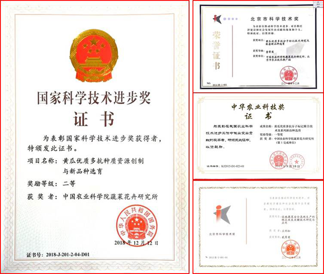 1)黄瓜优质多抗种质资源创制与新品种选育,2018年获国家科学技术进步奖二等奖
