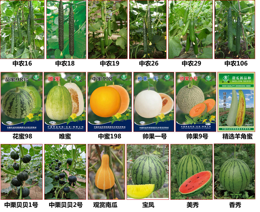 1) 黄瓜(Cucumber):中农16号(Zhongnong 16)、中农18号(Zhongnong 18)、中农20号(Zhongnong 20)、中农26号(Zhongnong 26)、中农28号(Zhongnong 28)、中农29号(Zhongnong 29)、中农37号(Zhongnong 37)、中农38号(Zhongnong 38)、中农50号(Zhongnong 50)、中农106号(Zhongnong 106)、中农116号(Zhongnong 116)、中农118号(Zhongnong 118)、中农46号(Zhongnong 46)、中农56号(Zhongnong 56)、中农48号(Zhongnong 48)、中农58号(Zhongnong 58)、中农脆绿1号(Zhongnong Cuilv 1)、中农脆绿2号(Zhongnong Cuilv 2)、中农脆玉1号(Zhongnong Cuiyu 1、中农脆玉2号(Zhongnong Cuiyu 2)、中农脆玉3号(Zhongnong Cuiyu 3);