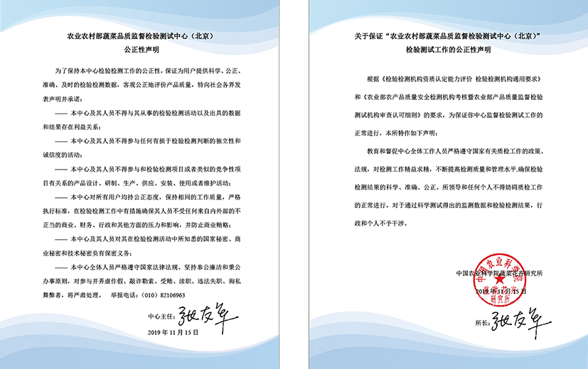 “中心”始终坚持“质量第一、依法办事、实事求是、科学公正”的质量方针和“科学、公正、高效、廉洁、服务”的宗旨,确保向社会提供公正、科学、准确、可靠的检检验结果,保证检验工作质量,为社会和客户提供高效、优质的检验服务,为政府服务、为市场服务、为生产服务和为科研服务,为保障全国农产品质量安全发挥重要的作用。