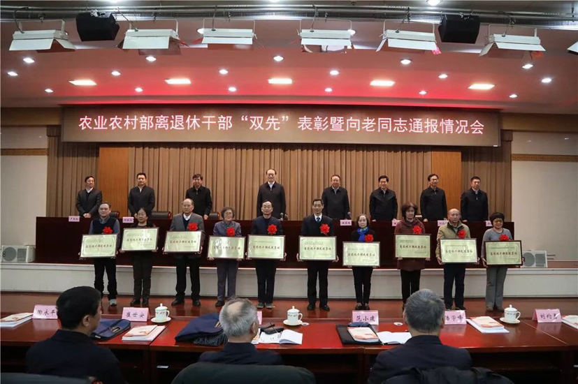 2019年12月27日,农业农村部离退休干部“双先”表彰暨向老同志通报情况会在京召开,我所第十八党支部荣获“先进集体”称号,支部和老同志代表姚永慧、王素参加会议。