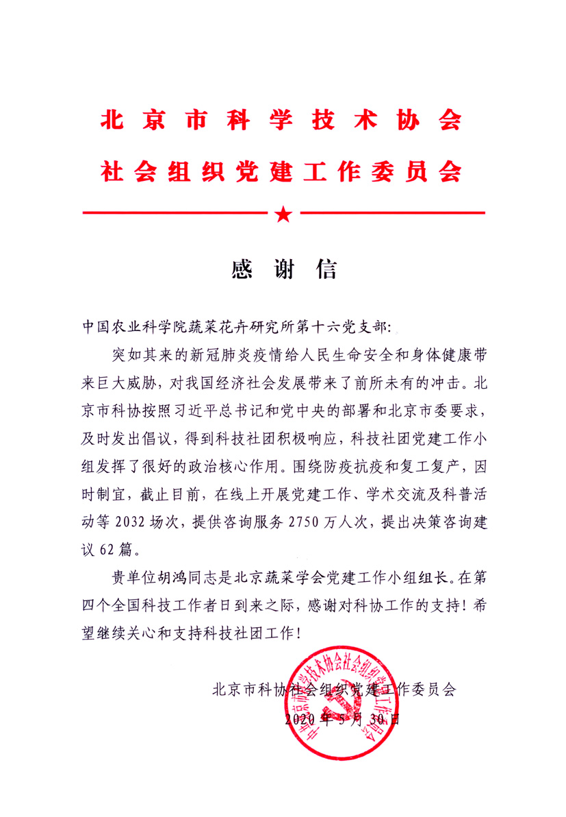 2020年5月30日,在第四个全国科技工作者日到来之际,我所第十六党支部收到来自北京市科学技术协会社会组织党建工作委员会的《感谢信》,信中对十六支部党员、北京市蔬菜学会党建工作小组组长胡鸿同志表达感谢。