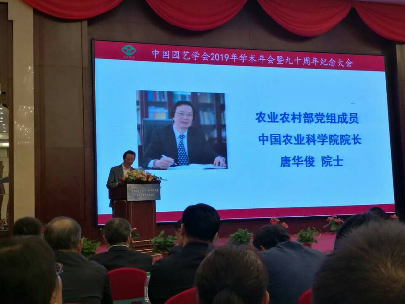 “中国园艺学会2019年学术年会暨成立九十周年纪念大会”,2019年10月21日至23日在河南省郑州市召开。大会主题为“牢记使命勇于登攀 继承传统开创未来”。农业农村部党组成员、中国农业科学院院长唐华俊院士、中国工程院原副院长刘旭院士出席会议并讲话。中国工程院方智远院士、吴明珠院士、束怀瑞院士、邓秀新院士、李天来院士、邹学校院士分别为中国园艺学会成立90周年题词祝贺。方智远院士、张改平院士、李天来院士出席会议。大会开幕式由中国园艺学会副理事长兼秘书长孙日飞研究员主持,学会理事长杜永臣、河南省农业农村厅党组成员王俊忠、河南农业大学校长张改平院士、摩根体育官网 所长张友军分别致辞。来自全国200多家科研院所、高等院校及企业的1000余名代表参加了会议。
