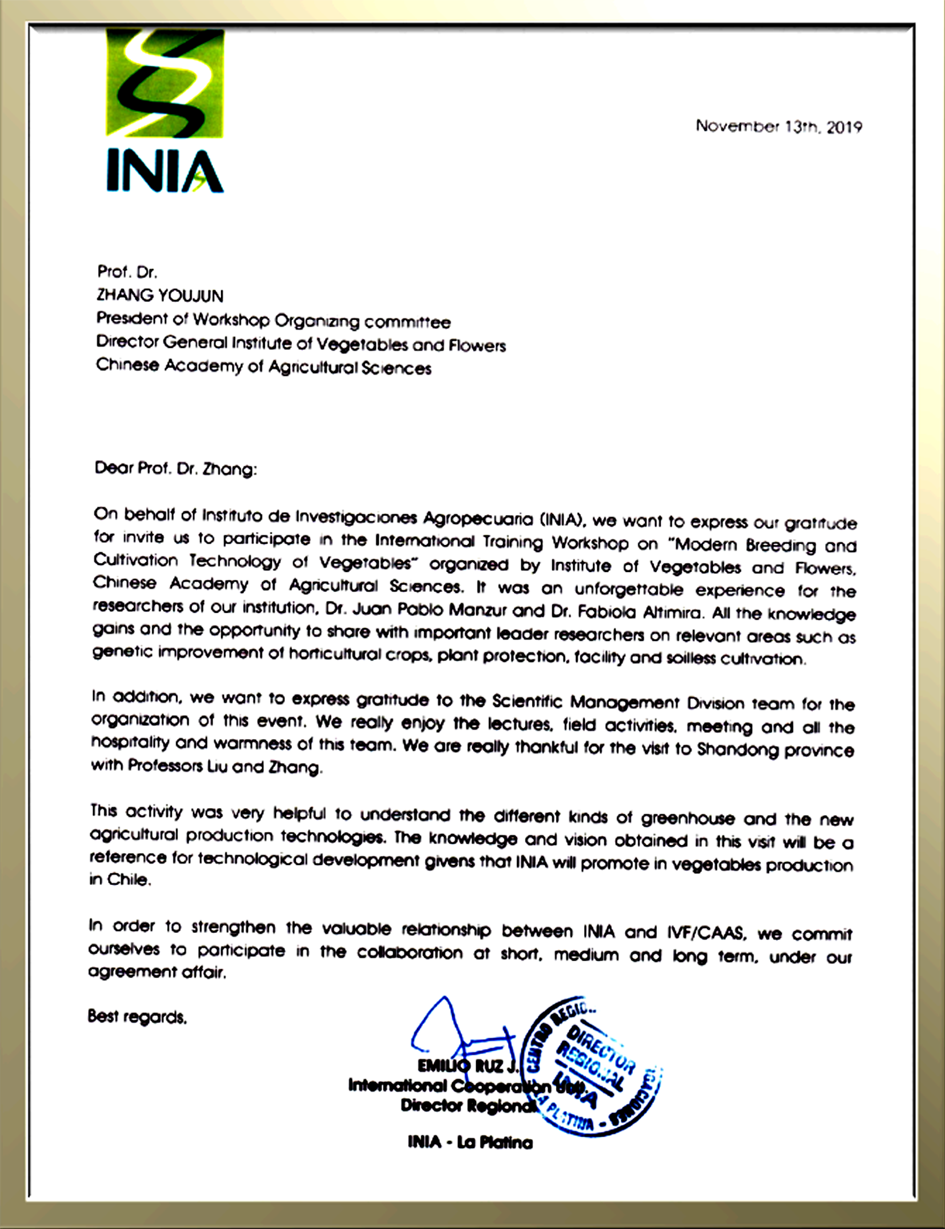 致中国农科院蔬菜花卉所张友军所长官方感谢信,对摩根体育官网 在拉普拉•提拉(La Platina)“智利-中国农业科技研发中心暨智利-中国蔬菜示范农场”合作平台的建设中,为智方在专业培训、人才联合培养、合作研究、实验室共建和种业合作等多方面所提供的帮助,以及蔬菜花卉所领导对中智项目的高度重视和大力支持表示最诚挚的谢意,并特别感谢蔬菜花卉所科研处在中智项目业务对接中的协调保障工作。