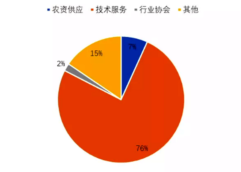 行业服务者问卷共收到310份,被调查者主要包括科研人员、行业协会、农资经营者、产中农机与植保等服务组织,其中技术服务人员占比 76%,农资供应占 7%,行业协会占 2%,其他占 15%。