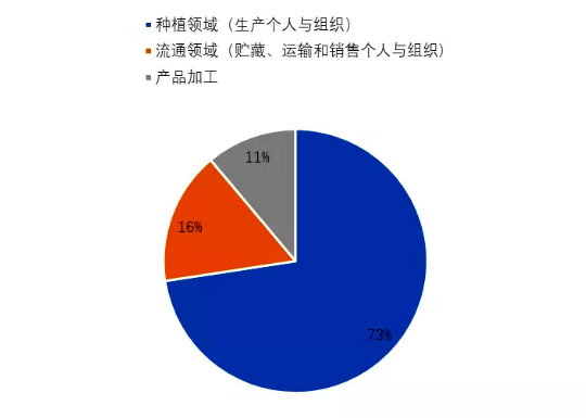 对行业经营主体调查共收到 135 份问卷,行业经营主体主要包括 生产、储藏、运输、加工和经销个人与组织,其中种植领域占比 73%, 流通领域占比 16%,产品加工占比 11%。