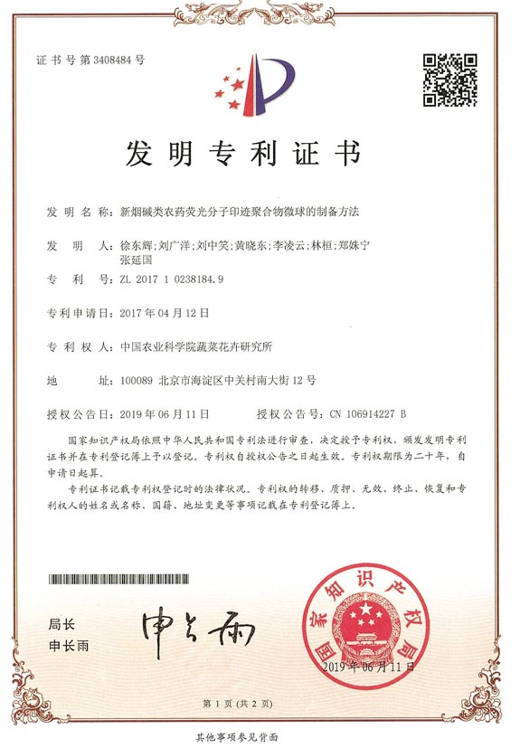 近日,农业农村部蔬菜产品质量安全控制重点实验室在新烟碱类农药残留快速检测技术研发方面取得重要进展,相关研究成果获得2项国家发明专利授权(ZL 201710238184.9;ZL 201710317094.9)。