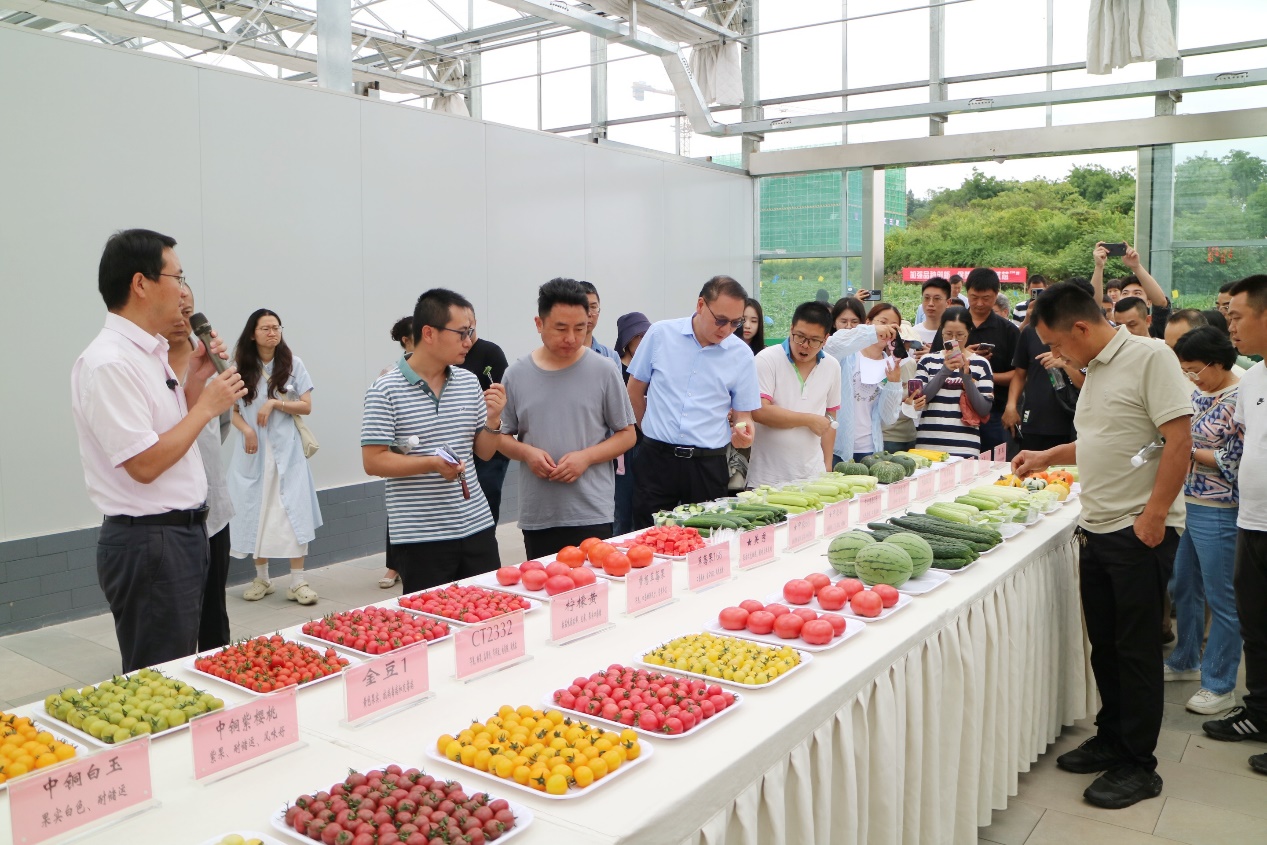 据西南研发中心主任王顺利研究员介绍,本次活动共展示蔬菜新品种427个,其中专家推荐品种15个;同时现场展示了低温寡照番茄高效生产、蔬菜生根壮根技术、芹菜水培绿色生产技术等10套高效栽培新技术,为川渝蔬菜产业注入新活力。活动现场还准备了“中农脆玉1号”黄瓜(第三届“三峡杯”优质蔬菜(黄瓜)金奖)、“中誉1877”胡萝卜、美秀西瓜、中铜系列樱桃番茄等超40个不同品种的蔬菜供与会人员品鉴与评价。王顺利希望通过此次活动,携手各方共探西南蔬菜产业创新发展之路。