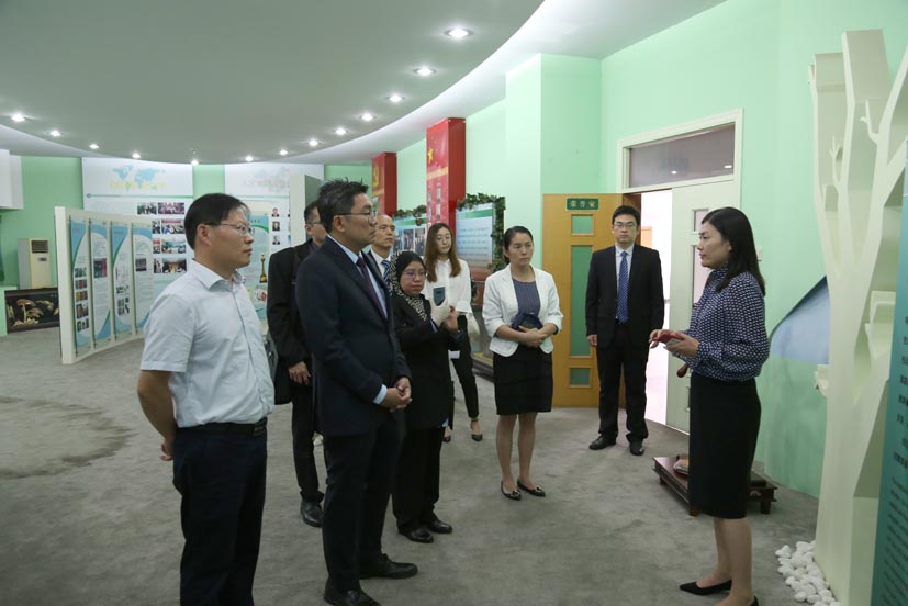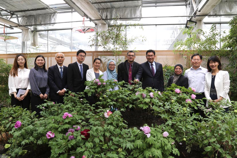 随后,沈志勤一行在张圣平副所长的陪同下参观了功能基因实验室及花卉牡丹展示园,在分子设计育种创新团队首席王晓武研究员的详细讲解下,对研究所在生物技术及基因组学的研究成果及国际合作有了更加深入的了解。在展示园中,张秀新研究员对外宾介绍了牡丹花期调控技术及牡丹成果转化各类产品,沈志勤对此项技术及产品表示出浓厚的兴趣并大加赞赏,希望能与研究所进一步开展合作交流,分享经验,促进双方合作共赢及可持续发展。