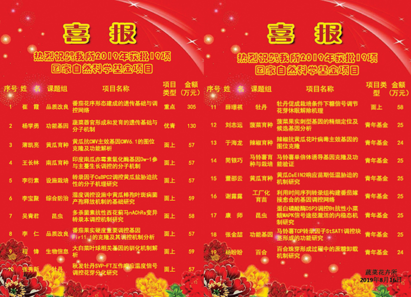 杨学勇副研究员申报的“蔬菜器官形成和发育的遗传基础与分子机制”获得优秀青年科学基金项目资助,这是继2013年和2017年获得优秀青年科学基金项目资助后,我所第3次获得该项目资助。表明研究所在青年人才培养、科技创新能力等方面取得良好进展。崔霞研究员申报的“番茄花序形态建成的遗传基础与调控网络”项目,获得重点基金资助,直接经费305万元,是我所获资助的第5个重点项目,表明我所基础研究和原始创新能力持续增强。