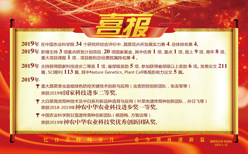 2019年,在中国农业科学院34个研究所综合评价中,蔬菜花卉所发展实力第4,总体排名第4。
