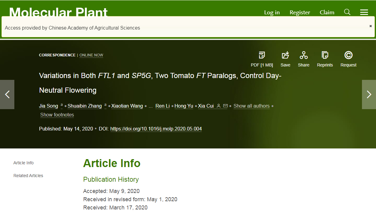 2020年5月15日,Molecular Plant在线发表了中国农科院摩根体育 崔霞课题组题为Variations in Both FTL1 and SP5G, Two Tomato FT Paralogs, Control Day-Neutral Flowering的研究论文。该论文报道了在番茄中发现的一个新的成花素同源蛋白FTL1,并解析了其在短日照条件下促进番茄开花的分子机制。