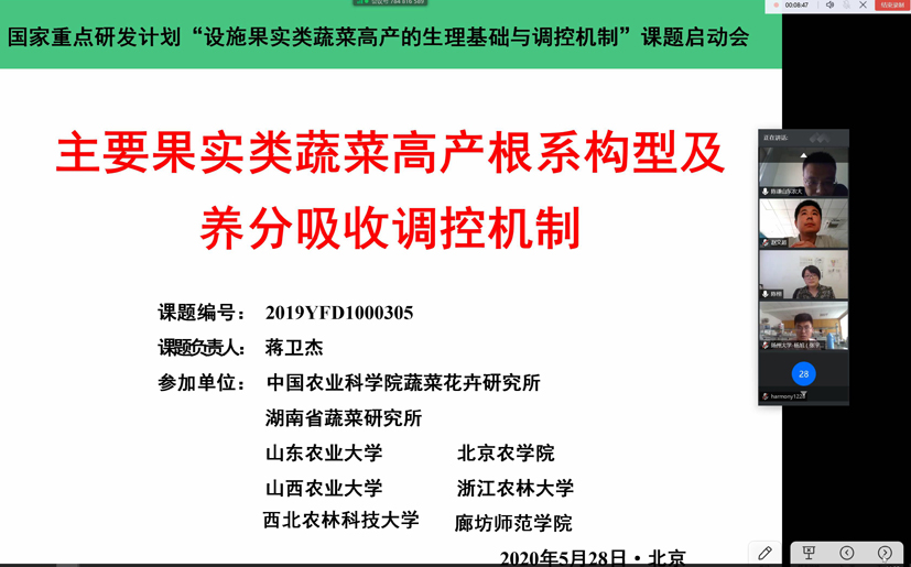 2020年5月28日,由摩根体育官网 主持的国家重点研发项目“设施果实类蔬菜高产的生理基础与调控机制”课题五“主要果实类蔬菜高产根系构型及养分吸收调控机制”以视频会议的形式召开课题启动会。会议邀请专门从事作物根系研究的中国科学院遗传与发育生物学研究所李传友研究员、山东大学丁兆军教授、福建农林大学陈栩教授到会对课题和子课题的内容进行点评。