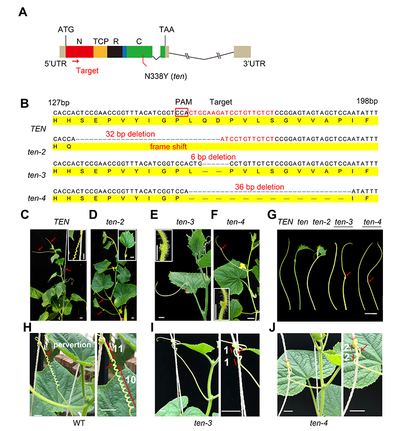 在设施生产上,黄瓜栽培需要吊蔓生长,不需要黄瓜卷须的攀缘能力,同时卷须的发育使得库容增大、竞争养分,需要及时地去除卷须,以促进黄瓜的健康生长、保证坐果。人工去除卷须费时费工,因此培育适合轻简化栽培的无卷须品种,是黄瓜株型改良的一个重要方向。该团队前期研究克隆了控制黄瓜卷须发育的身份基因TEN,并揭示了黄瓜卷须的同源器官是侧枝——这一曾经困扰达尔文的植物发育学谜团。