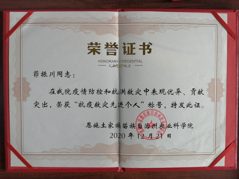 茆振川为中组部第20批博士服务团成员,自2020年元旦挂职担任恩施土家族苗族自治州农业科学院副院长,协管科研工作及人才培养,同时配合农业农村部扶贫联络组开展恩施州脱贫攻坚工作。12月30日,茆振川挂职期满,蔬菜所人事处受中组部、农业农村部委托完成考核工作。