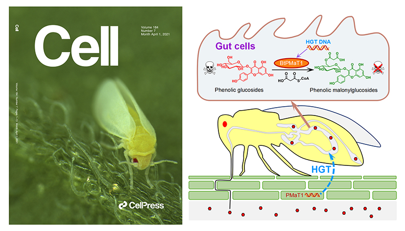 北京时间3月25日,《细胞(Cell)》以封面论文的形式发表了摩根体育官网 张友军团队的最新研究成果。该研究在国际上首次揭示了昆虫通过水平基因转移方式“偷窃”植物源解毒基因,进而分解掉植物的防御性物质,使自身可直接取食600多种植物。研究团队不但发现昆虫“以子之矛,攻子之盾”的进化现象,还为探索昆虫适应性进化规律开辟了新的视角,是多食性昆虫广泛寄主适应性进化机制研究的重大突破,创新了害虫种群暴发危害理论,为研发烟粉虱精准绿色防控技术提供全新思路。