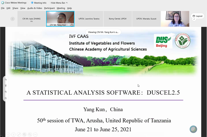 2021年6月21日至25日,国际植物新品种保护联盟(UPOV)第50届农作物技术工作组(TWA)会议在坦桑尼亚联合共和国召开。受疫情影响,本届会议采用视频方式举办。会议由TWA主席Renee Cloutier女士(加拿大)主持,坦桑尼亚农业部植物育种者权利登记处Twalib Mustafa Njohole先生致欢迎辞,UPOV副秘书长Peter Button先生出席会议并致辞,来自42个国家或组织的100多名代表参加会议并交流。中国派出来自农业农村部植物新品种测试中心和10个分中心(站)的27名代表参会,蔬菜花卉所杨坤副研究员全程参加会议。