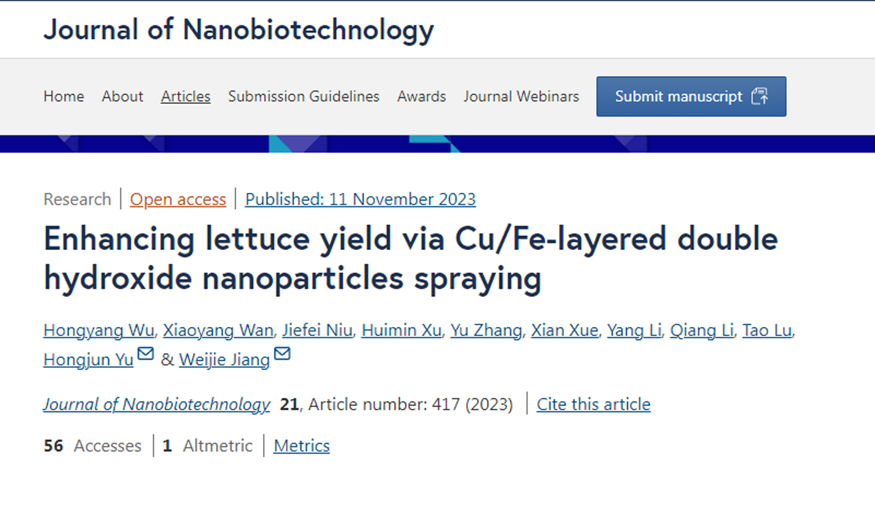 近日,摩根体育官网 蔬菜栽培与生理创新团队在国际知名学术期刊《Journal of Nanobiotechnology》(IF: 10.2)上发表了题为“Enhancing lettuce yield via Cu/Fe-la...