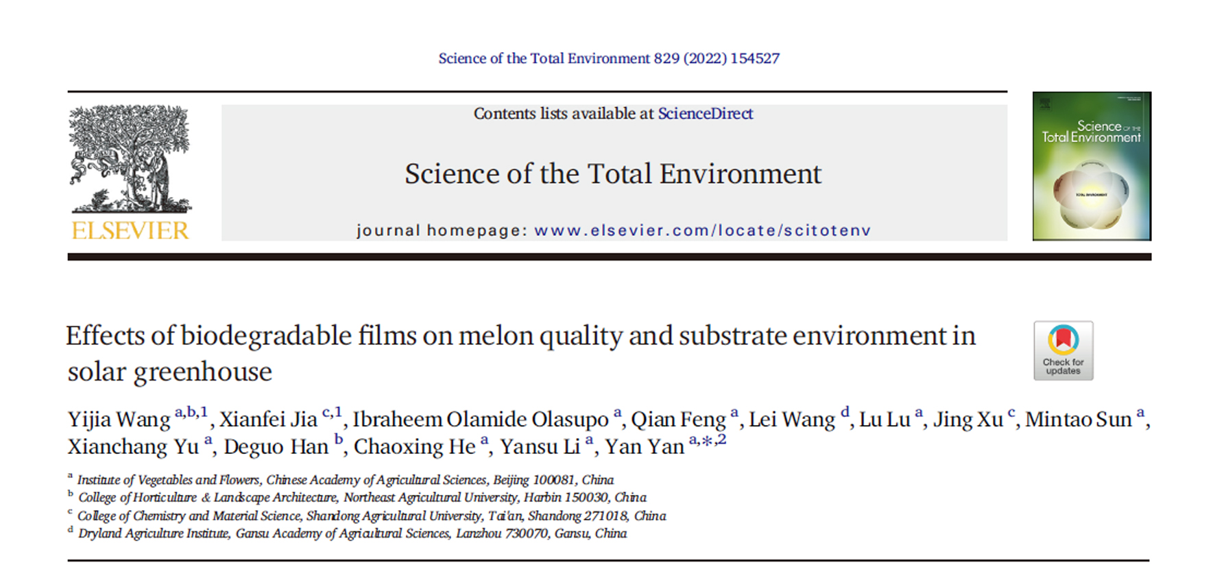近日,摩根体育官网 设施栽培课题组闫妍副研究员发现,使用PBAT/PLA和PBAT/木质素两种生物可降解地膜对日光温室秋冬季甜瓜产量和品质。相关研究成果以“Effects of biodegradable films on m...