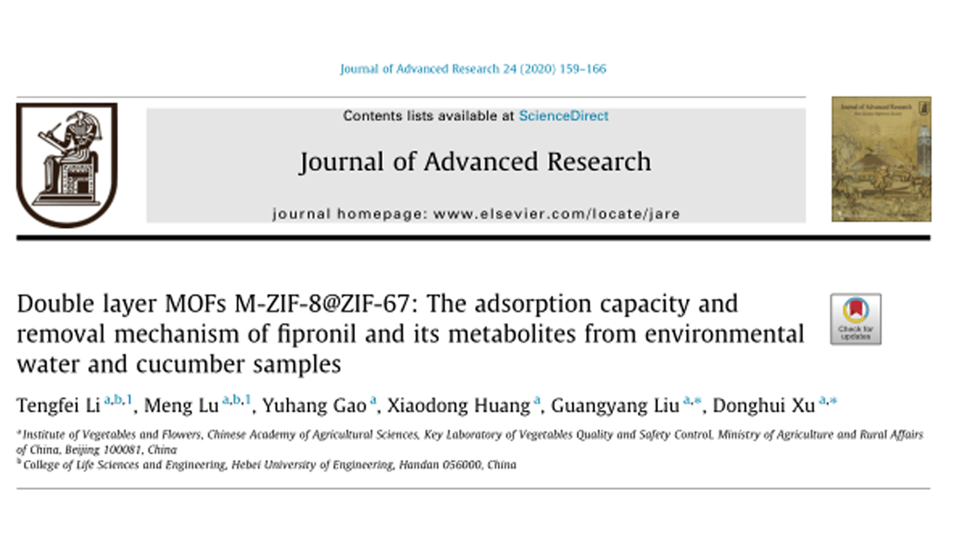 近日,农业农村部蔬菜质量安全控制重点实验室在双层MOFs结构调控和MOFs型SPE柱研发方面取得重要进展,相关成果发表在国际SCI期刊Jou...