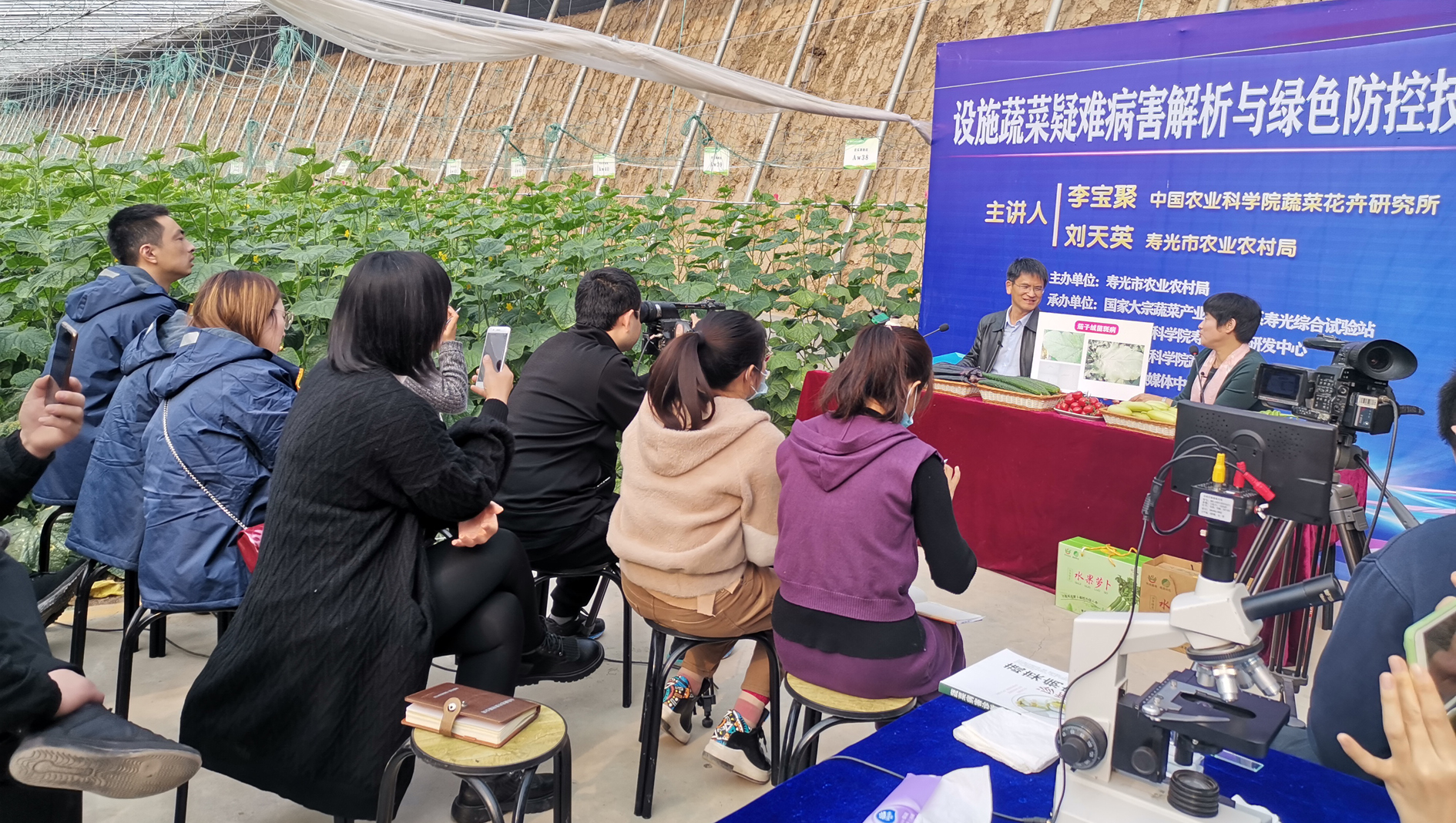 近日,一场主题为“设施蔬菜疑难病害解析与绿色防控技术”的直播交流会在洛城街道的一座大棚里拉开了帷幕,蔬菜大棚变身“直播间”,蔬菜花卉所李宝聚研究员与寿光市农业农村局刘天英老师现场讲技术。