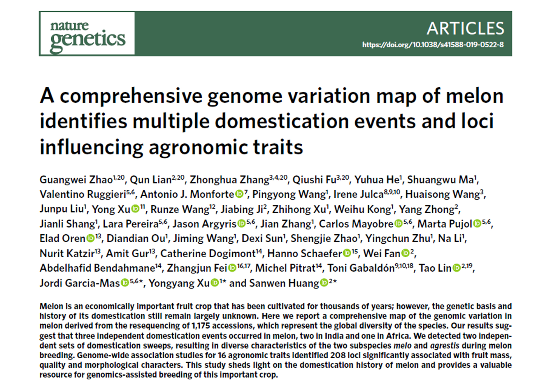 • 2019-11-02 摩根体育 参与揭示甜瓜驯化机制-于11月2日在《自然-遗传学》(Nature Genetics)在线发表