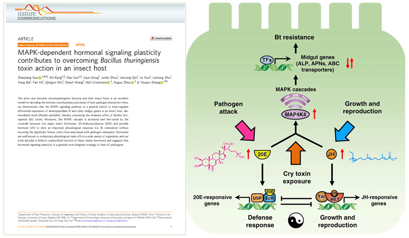6月12日,《自然·通讯》(Nature Communications)在线发表了我所张友军研究员领衔的蔬菜虫害防控创新团队关于昆虫对苏云金芽胞杆菌(Bt)抗性分子机制的最新研究成果,他们发现昆虫激素水平升高可以激活MAPK信号途径反式调控多个中肠受体基因差异表达,从而导致小菜蛾对Bt杀虫蛋白Cry1Ac的高抗性。该研究首次揭示了昆虫激素可以参与害虫抗药性的新功能及其分子调控网络,研究结果对于指导重大农业害虫对Bt抗性的监测预警以及转Bt基因抗虫作物的抗性治理具有重要的理论和实践意义。相关内容以“MAPK-dependent hormonal signaling plasticity contributes to overcoming Bacillus thuringiensis toxin action in an insect host”为题在线发表于国际著名Nature子刊Nature Communications上。据悉,今年是Nature Communications创刊10周年,而这是Nature Communications自创刊以来首次接收发表昆虫Bt抗性研究领域的研究论文。而且,鉴于该研究成果的创新性和重要性,在本文被Nature Communications接收发表后,Nature旗下生态和进化学术论坛(Nature Research Ecology & Evolution Community)主管Emma Thompson博士专门邀请本文作者为其“文章背后的故事”专栏(Behind the Paper channel)撰写文章介绍该突破性研究成果,文章以“Hormonal regulation of Bt resistance in the diamondback moth”为题同步配发并分享了本研究背后的故事。值得注意的是,这是张友军团队围绕昆虫MAPK信号途径开展深入研究并将取得的研究成果发表在国际著名期刊PLoS Genetics (2015)和PNAS (2020)之后的又一全新力作。