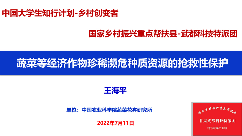 为促进“十四五”国家重点研发计划“农业生物种质资源挖掘与创新利用”重点专项项目“蔬菜等经济作物珍稀濒危种质资源的抢救性保护”的顺利实施,落实国家科技创新有关部署安排和国家乡村振兴计划,2022年7月11日,摩根体育官网 种质资源研究室举办“蔬菜等经济作物珍稀濒危种质资源的抢救性保护”线上培训会。中国大学生知行促进计划“乡村创变者”项目参与者(包括来自中国农业大学、上海交通大学、青岛农业大学、北京科技大学、东南大学、江南大学、山西农业大学、东北农业大学、四川农业大学、河北农业大学等高校10支团队同学)、甘肃武都区农业农村局相关领导、各乡镇相关科技人员、合作社负责人以及农民等共计400多人参加了培训会。