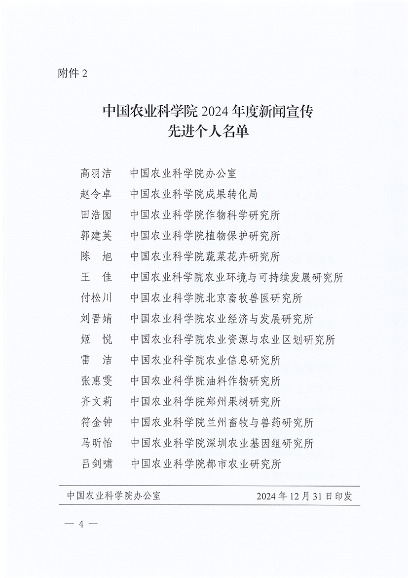 蔬菜花卉所喜获中国农业科学院2024年度新闻宣传先进单位和先进个人表彰