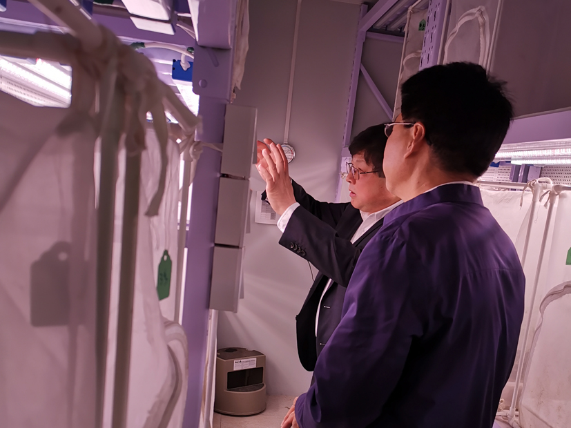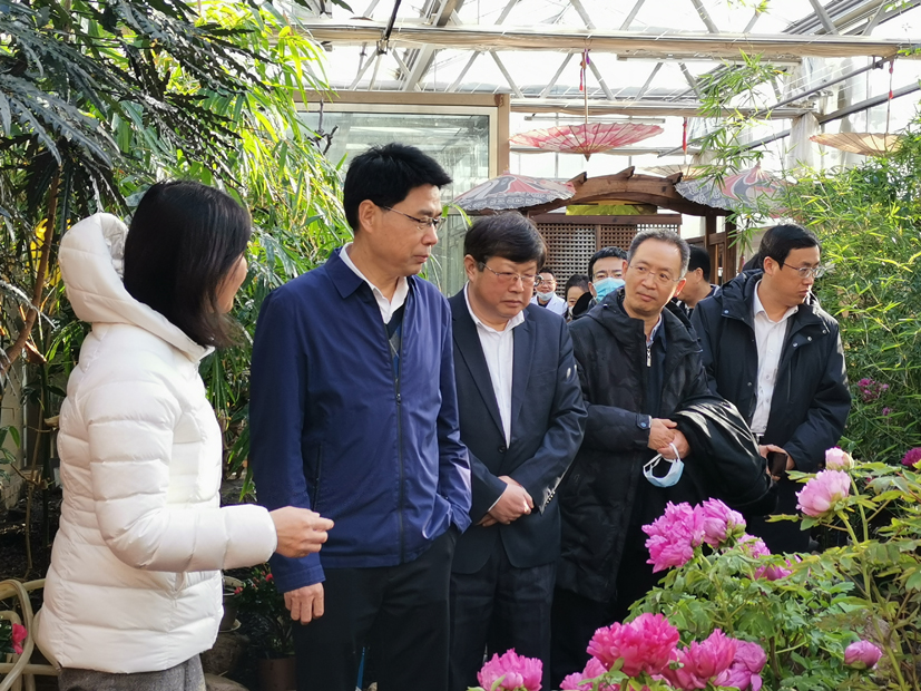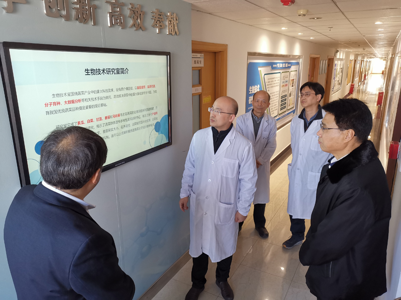 杨振海先后考察了牡丹四季温室、昆虫饲养温室和分子育种实验室,与科研人员亲切交谈,详细了解了创新团队科研工作情况、取得的成绩。随后,听取了张友军所长对研究所基本情况和科技支撑蔬菜种业高质量发展情况汇报。