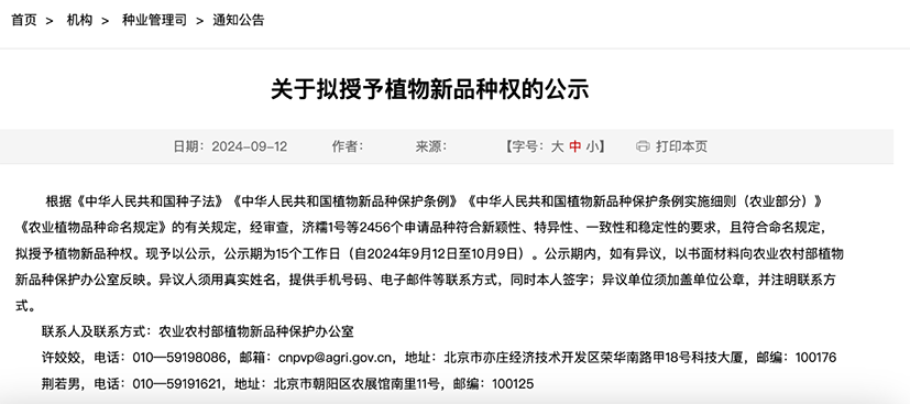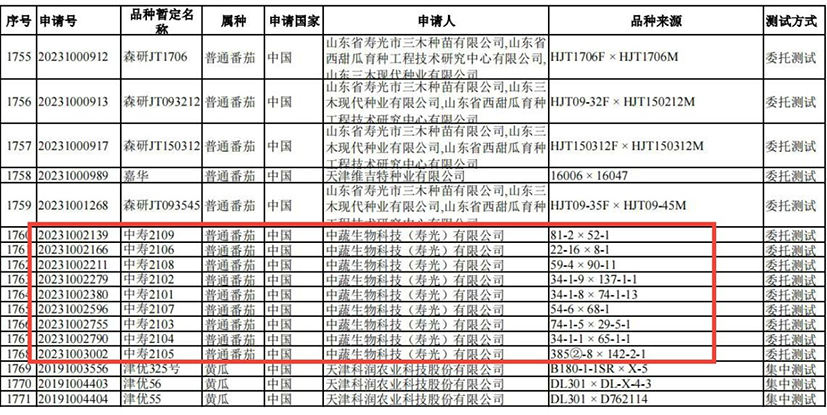 9月12日,农业农村部植物新品种保护办公室发布“关于拟授予植物新品种权的公示”。中国农科院寿光研发中心实体运行机构中蔬生物科技(寿光)有限公司培育成功的9个番茄新品种“中寿2101”、“中寿2102”、“中寿2103”、“中寿2104”、“中寿2105”、“中寿2106”、“中寿2107”、“中寿2108”、“中寿2109”位列公示名单内,拟被授予植物新品种权。